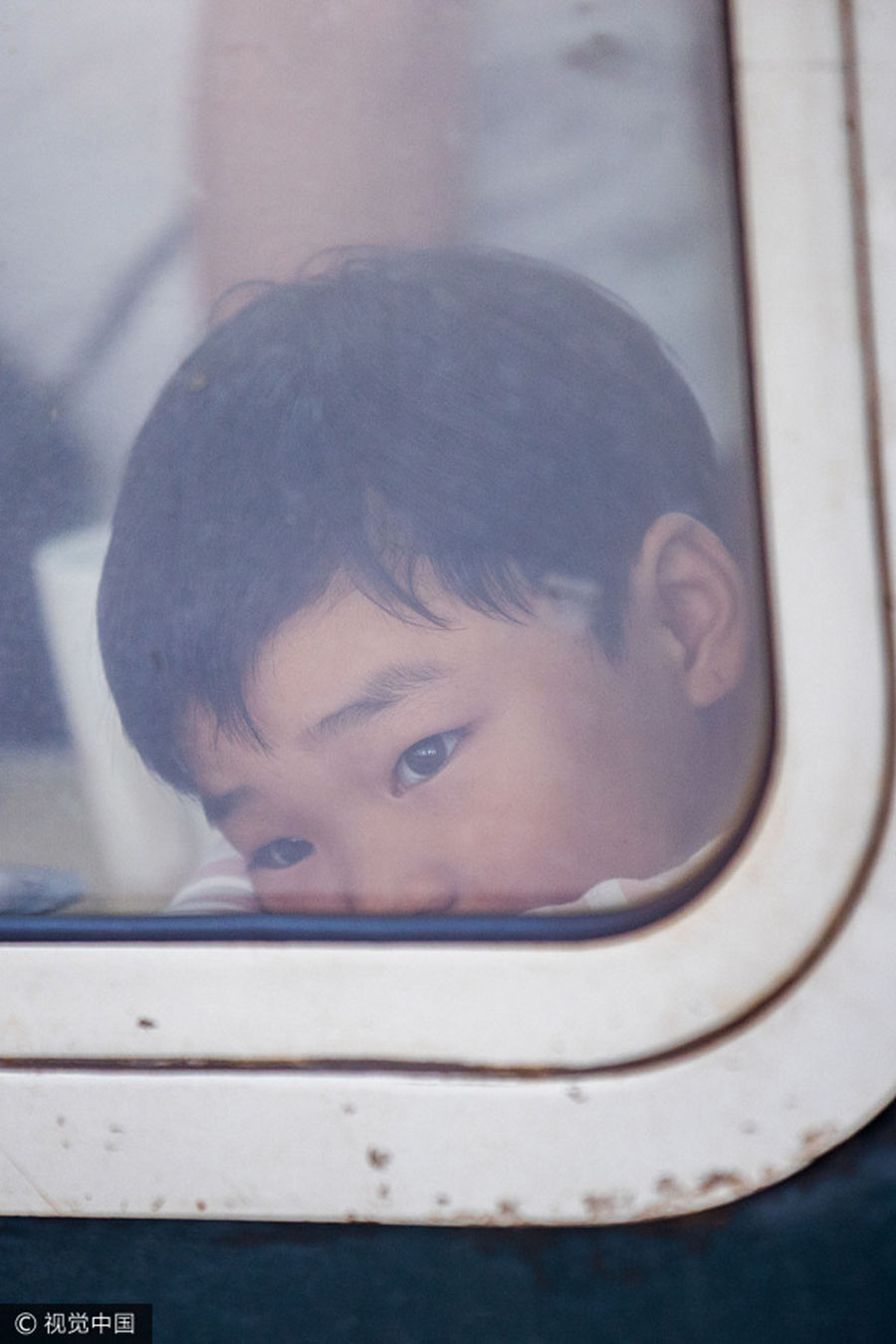 Un chico mira por la ventana mientras espera que salga el tren desde Hangzhou, capital de la provincia de Zhejiang. Cuando las vacaciones de verano llegan a su fin, muchos hijos de los trabajadores migrantes que viajaron a las grandes ciudades para visitar a sus padres tienen que despedirse y volver al pueblo natal. 21 de agosto del 2017. [Foto: VCG]