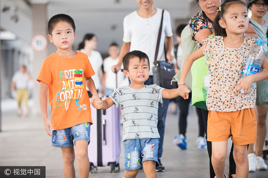 Los padres acompa?an a sus hijos a tomar el tren en la estación de ferrocarril de Hangzhou, provincia de Zhejiang. Cuando las vacaciones de verano llegan a su fin, muchos hijos de los trabajadores migrantes que viajaron a las grandes ciudades para visitar a sus padres tienen que despedirse y volver al pueblo natal. 21 de agosto del 2017. [Foto: VCG]