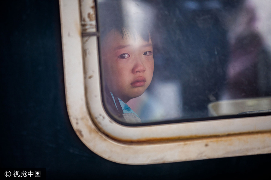 Zhejiang, 22/08/2017 (El Pueblo en Línea) - Un chico mira por la ventana mientras espera que salga el tren desde Hangzhou, capital de la provincia de Zhejiang. Cuando las vacaciones de verano llegan a su fin, muchos hijos de los trabajadores migrantes que viajaron a las grandes ciudades para visitar a sus padres tienen que despedirse y volver al pueblo natal. 21 de agosto del 2017. [Foto: VCG]