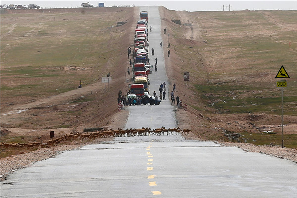 Los oficiales de la reserva natural de Hoh Xil detienen el tráfico mientras que el antílope tibetano cruza la carretera durante sus migraciones en la meseta Qinghai-Tíbet. [Foto: Wang Zhuangfei]