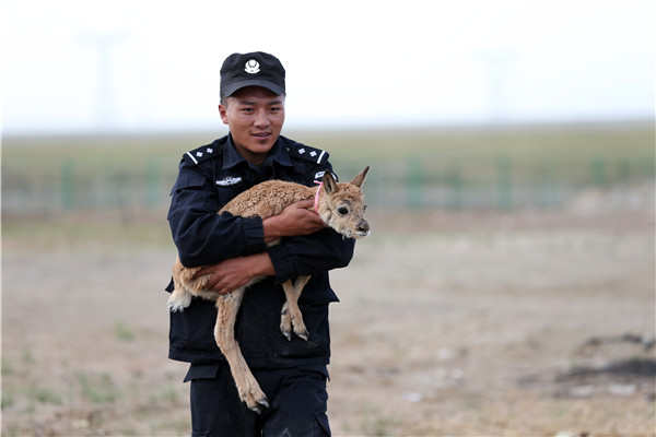 El cuidado de un antílope huérfano es parte del trabajo diario de los oficiales de patrulla en la estación Sonam Dargye. [Foto: Wang Zhuangfei]