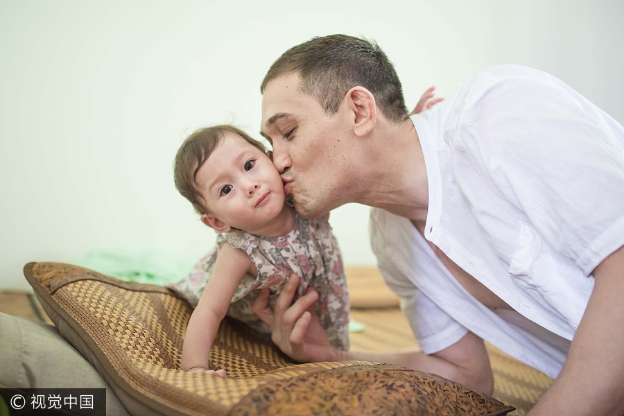 Julien Vandelli besa a su hija en Guangzhou, Guangdong, 8 de agosto del 2017. [Foto: VCG]