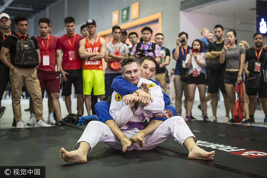 Julien Vandelli y sus estudiantes practican Jujitsu brasile?o en Guangzhou, Guangdong, 5 de agosto del 2017. [Foto: VCG]