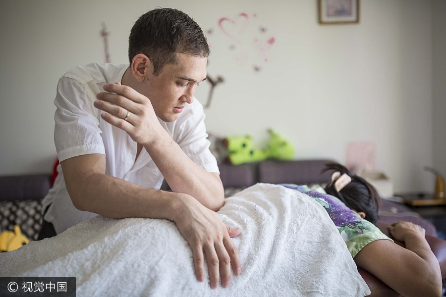Julien Vandelli ofrece masajes a su suegra en Guangzhou, Guangdong, 5 de agosto del 2017. [Foto: VCG]