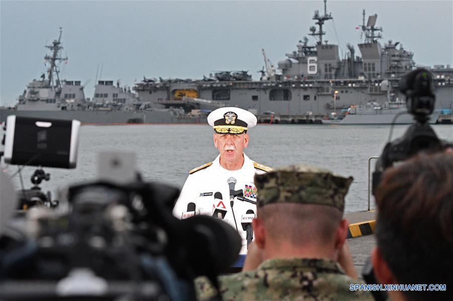 SINGAPUR, agosto 22, 2017 (Xinhua) -- El comandante de la Flota del Pacífico de Estados Unidos, Scott Swift, participa durante una conferencia de prensa sobre la colisión del USS John S. McCain con un petrolero mercante, en la Base Naval Changi de Singapur, Singapur, el 22 de agosto de 2017. El comandante de la Flota del Pacífico de Estados Unidos, Scott Swift, dijo el martes que se han encontrado restos mortales de los marineros desaparecidos en el destructor estadounidense que colisionó hace un día con un petrolero frente a la costa de Singapur. (Xinhua/Then Chih Wey)