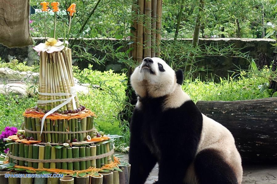 SICHUAN, agosto 23, 2017 (Xinhua) -- El panda gigante Bao Bao se prepara para tomar su tarta de cumplea?os en el Centro de Conservación e Investigación de China para Pandas Gigantes, en la ciudad de Dujiangyan, provincia de Sichuan, en el suroeste de China, el 23 de agosto de 2017. Bao Bao, una hembra de panda gigante nacida en Estados Unidos, celebró el miércoles su cuarto cumplea?os en la provincia de Sichuan. El personal de la base Dujiangyan del Centro de Conservación e Investigación de China para Pandas Gigantes preparó un pastel de cumplea?os de 50 kilos, hecho de bambú, zanahorias, bollos al vapor y manzanas. Bao Bao nació el 23 de agosto de 2013 en el Zoológico Nacional Smithsonian, en Washington D. C., el segundo ejemplar que nace allí. (Xinhua/Yuan Qiuyue)
