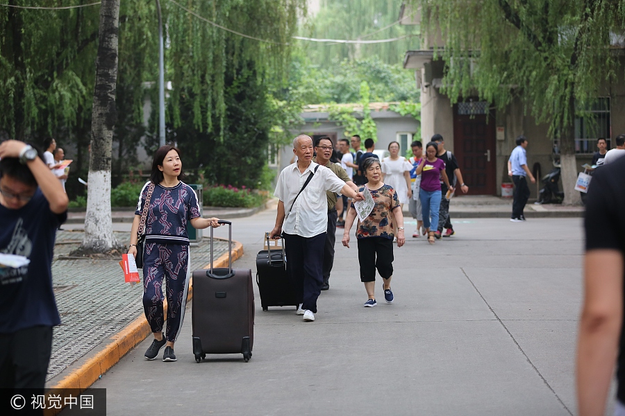 Padres y abuelos acompa?an a los nuevos estudiantes a una universidad en Xi'an, provincia de Shaanxi, noroeste de China, el 19 de agosto de 2017. [Foto / VCG]
