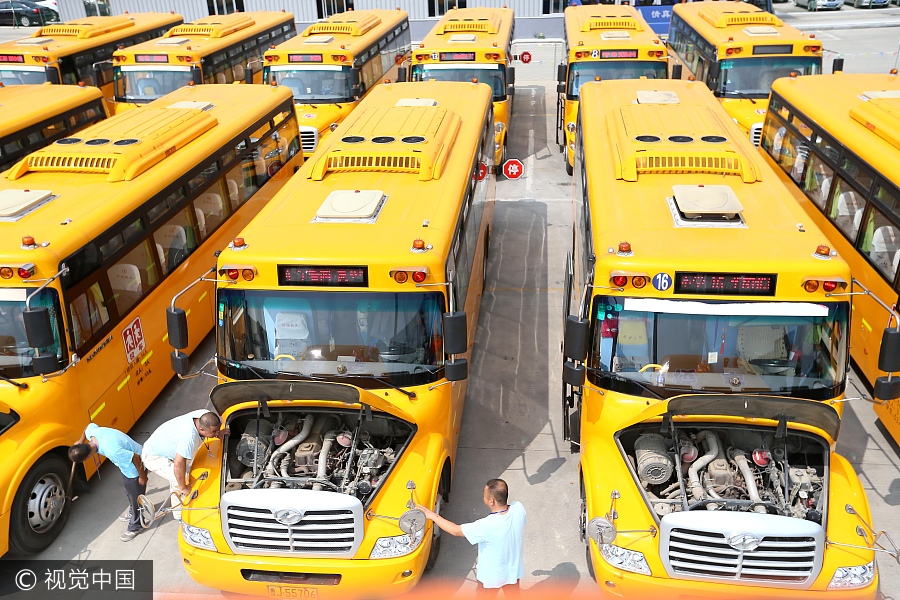 Técnicos del grupo de transporte Tai'an en Ningyang, provincia de Shandong, comprueban los autobuses escolares antes del nuevo semestre, el 22 de agosto de 2017. [Foto / VCG]