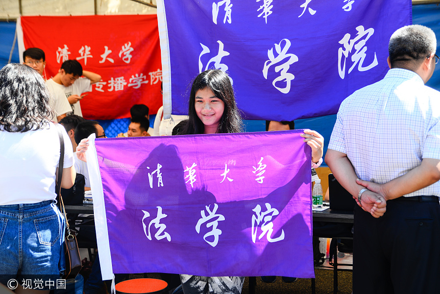 Un estudiante posa con la bandera de la Facultad de Derecho de la Universidad de Tsinghua en Beijing, el 23 de agosto de 2017. Cerca de 3.800 estudiantes de todo el mundo llegaron a la universidad para registrarse el miércoles. [Foto / VCG]