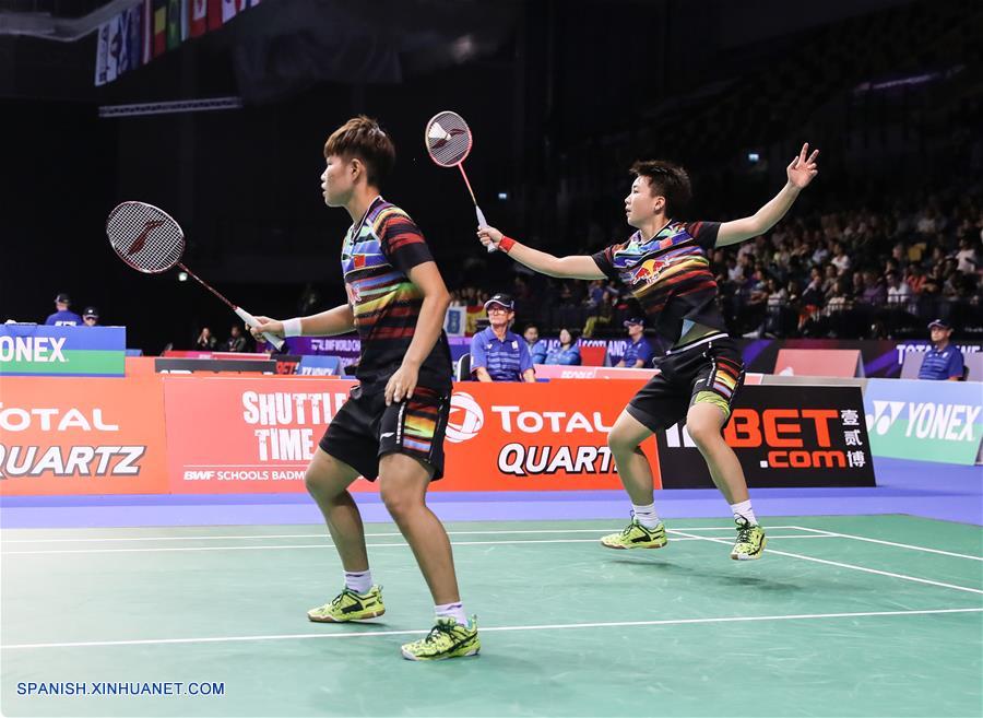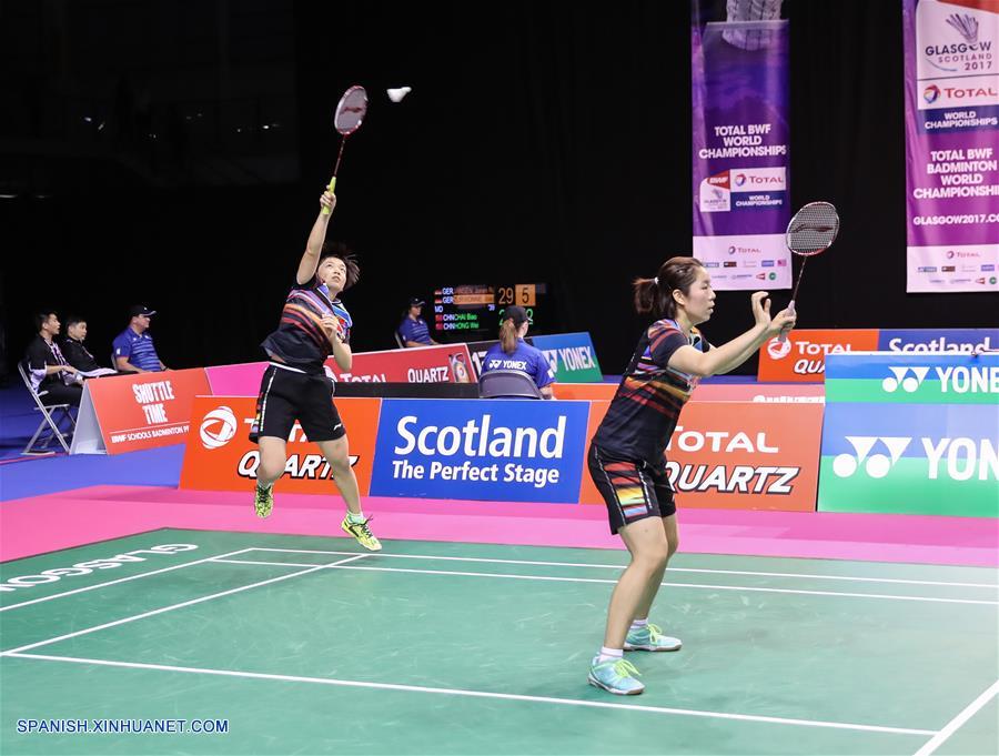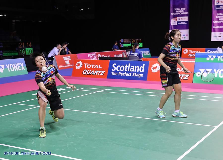 GLASGOW, 24 ago (Xinhua) -- Chen Qingchen (I) y Jia Yifan de China compiten durante un partido de la segunda ronda de dobles femeninos contra Chiang Kai Hsin y Hung Shih Han de Taipei de China en el Campeonato Mundial de Badminton BWF en Glasgow, Gran Breta?a, el 23 de agosto. Chen y Jia ganaron 2-0. (Xinhua/Shan Yuqi)