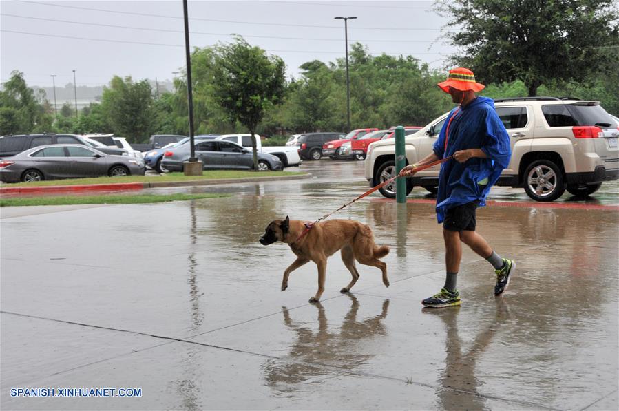 HOUSTON, agosto 28, 2017 (Xinhua) -- Una persona y su perro se dirigen hacia el refugio en el Constellation Field, en Sugar Land cerca de Houston, Estados Unidos, el 28 de agosto de 2017. La prioridad en este momento es evacuar a las personas varadas en sus casas y los albergues de la zona de Gran Houston ya han recibido a cerca de 5.000 personas, dijo el lunes en conferencia de prensa, el alcalde de Houston, Sylvester Turner. (Xinhua/Liu Liwei)