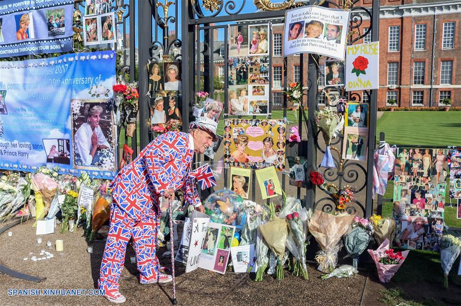 LONDRES, agosto 31, 2017 (Xinhua) -- Un hombre deposita una ofrenda en la Puerta del Palacio de Kensington en el 20 aniversario del fallecimiento de la princesa Diana, en Londres, Reino Unido, el 31 de agosto de 2017. El vigésimo aniversario de la trágica muerte de la princesa Diana de Gales fue conmemorado el jueves por sus admiradores en todo Reino Unido. Afuera del Palacio de Kensington, en Londres, donde vivía la princesa, la gente colocó flores y velas como tributo. Descrita como "la princesa del pueblo", Diana perdió la vida en un accidente automovilístico en un paso subterráneo de París el 31 de agosto de 1997 a la edad de 36 a?os. Muchas personas permanecieron en silencio fuera de las puertas del palacio en un solemne recuerdo. (Xinhua/Amer Ghazzal/Rex Shutterstock/ZUMAPRESS)