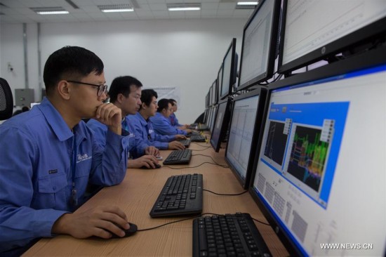 Foto del 1 de septiembre de 2017 muestra a ingenieros en la sala de control del acelerador circular para la Fuente de Neutrones porEspalación” de China (CSNS) en Dongguan, provincia de Guangdong. Según una rueda de prensa celebrada el viernes en el Instituto de Física de Alta Energía de la Academia China de Ciencias en Dongguan, el 28 de agosto de 2017 se obtuvo por primera vez un rayo de neutrones en el CSNS, lo que marca la finalización de la construcción principal y el inicio de la fase de operación de pruebas para el proyecto CSNS, una gran instalación científica a nivel nacional. El proyecto debe estar completamente terminado y abierto a los usuarios chinos y extranjeros para el a?o 2018 según lo programado. (Xinhua / JinLiwang)