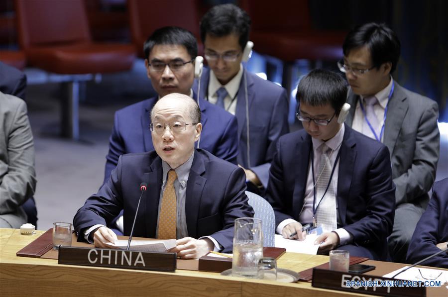 Liu Jieyi (frente), el representante permanente de China ante la Organización de las Naciones Unidas (ONU), participa durante una reunión de emergencia del Consejo de Seguridad de la ONU sobre la prueba nuclear de República Popular Democrática de Corea (RPDC), en la sede de la ONU en Nueva York, Estados Unidos, el 4 de septiembre de 2017. Varios miembros del Consejo de Seguridad de las Naciones Unidas (CSNU) han demandado una reacción firme a la reciente prueba nuclear de la República Popular Democrática de Corea (RPDC). (Xinhua/Li Muzi)