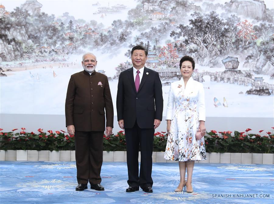 El presidente de China, Xi Jinping, y su esposa, Peng Liyuan, dan la bienvenida al primer ministro de India, Narendra Modi, antes de un banquete para aquellos que asisten a la novena Cumbre de los BRICS (Brasil, Rusia, India, China y Sudáfrica) y el Diálogo de Mercados Emergentes y Países en Desarrollo, en Xiamen, en la provincia de Fujian, en el sureste de China, el 4 de septiembre de 2017. (Xinhua/Ma Zhancheng)
