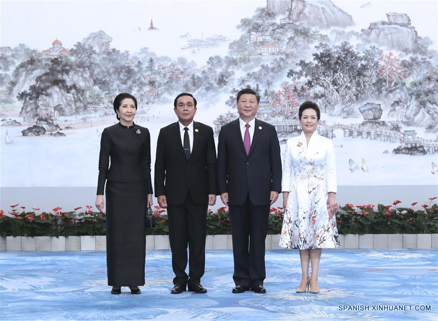 El presidente de China, Xi Jinping, y su esposa, Peng Liyuan, dan la bienvenida al primer ministro de Tailandia, Prayut Chan-o-cha, y su esposa, antes de un banquete para aquellos que asisten a la novena Cumbre de los BRICS (Brasil, Rusia, India, China y Sudáfrica) y el Diálogo de Mercados Emergentes y Países en Desarrollo, en Xiamen, en la provincia de Fujian, en el sureste de China, el 4 de septiembre de 2017. (Xinhua/Ma Zhancheng)