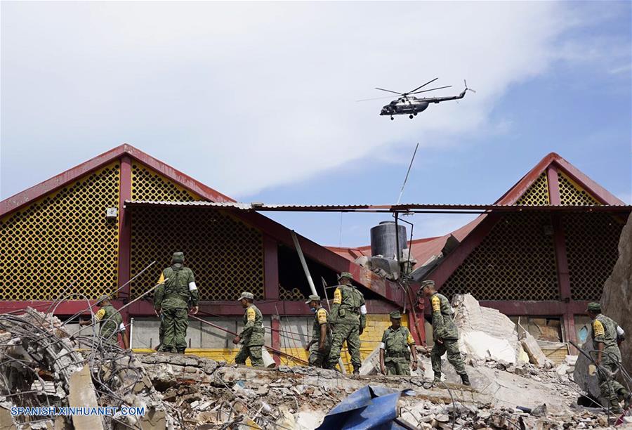 OAXACA, septiembre 8, 2017 (Xinhua) -- Miembros de las fuerzas de seguridad trabajan en el sitio de un derrumbe provocado por un sismo en Juchitán, estado de Oaxaca, México, el 8 de septiembre de 2017. (Xinhua/David de la Paz)