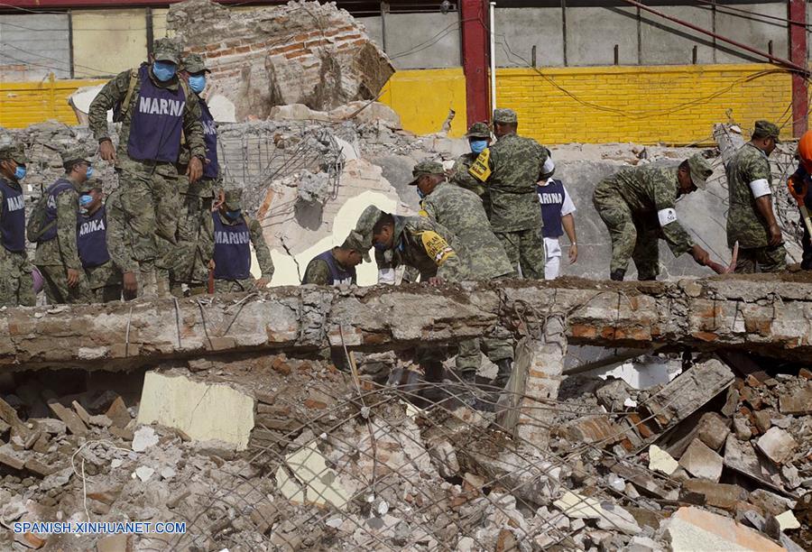 OAXACA, septiembre 8, 2017 (Xinhua) -- Miembros de las fuerzas de seguridad trabajan en el sitio de un derrumbe provocado por un sismo en Juchitán, estado de Oaxaca, México, el 8 de septiembre de 2017. (Xinhua/David de la Paz)