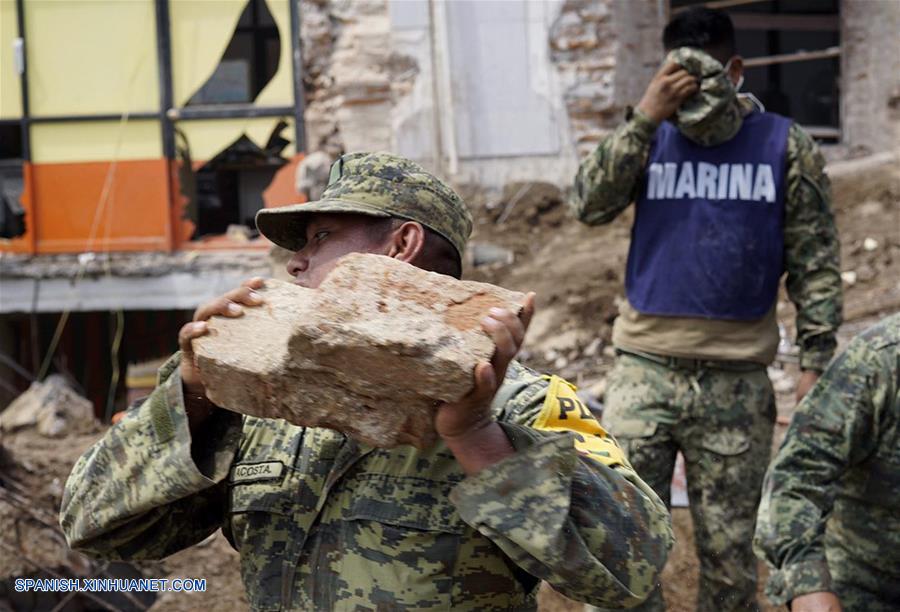 OAXACA, septiembre 8, 2017 (Xinhua) -- Miembros de las fuerzas de seguridad trabajan en el sitio de un derrumbe provocado por un sismo en Juchitán, estado de Oaxaca, México, el 8 de septiembre de 2017. (Xinhua/David de la Paz)