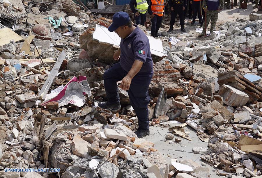 OAXACA, septiembre 8, 2017 (Xinhua) -- Un miembro de las fuerzas de seguridad trabaja en el sitio de un derrumbe provocado por un sismo en Juchitán, estado de Oaxaca, México, el 8 de septiembre de 2017. (Xinhua/David de la Paz)