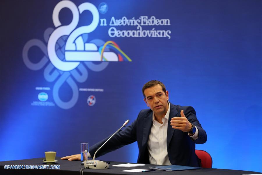 El primer ministro griego, Alexis Tsipras, participa en una conferencia de prensa durante la 82 Feria Internacional de Tesalónica, celebrada en Tesalónica, Grecia, el 10 de septiembre de 2017. (Xinhua/Marios Lolos)
