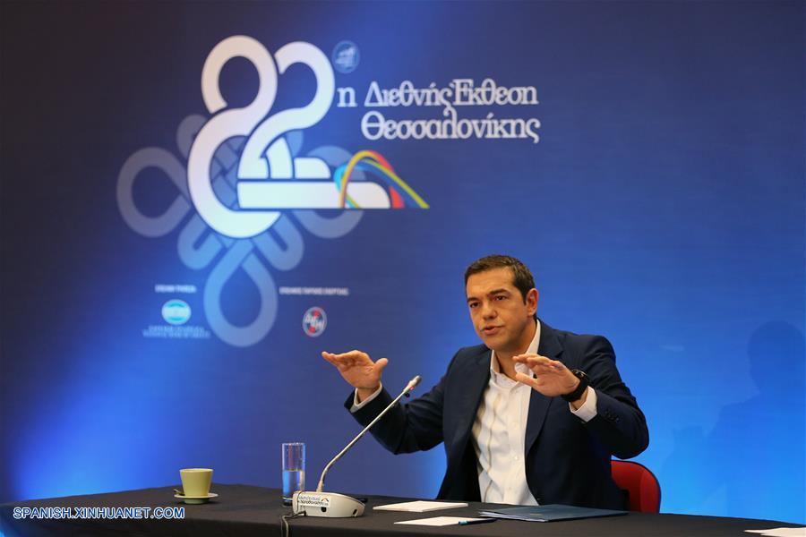 El primer ministro griego, Alexis Tsipras, participa en una conferencia de prensa durante la 82 Feria Internacional de Tesalónica, celebrada en Tesalónica, Grecia, el 10 de septiembre de 2017. (Xinhua/Marios Lolos)