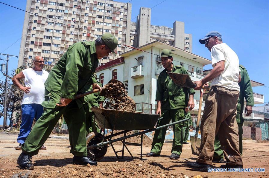 Miembros de las Fuerzas Armadas Revolucionarias de Cuba participan durante las labores de recuperación y limpieza tras el paso del huracán Irma, en una calle en el municipio Plaza de la Revolución, en La Habana, Cuba, el 11 de septiembre de 2017. El huracán Irma dejó al menos 10 muertos en Cuba, aseguró el lunes un informe del Estado Mayor de la Defensa Civil de la isla publicado por la televisión estatal. Los fallecidos son de las provincias de La Habana, Matanzas, Camagüey y Ciego de Avila en el centro y occidente de la isla. (Xinhua/Joaquín Hernández)