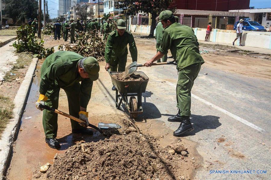 Miembros de las Fuerzas Armadas Revolucionarias de Cuba participan durante las labores de recuperación y limpieza tras el paso del huracán Irma, en una calle en el municipio Plaza de la Revolución, en La Habana, Cuba, el 11 de septiembre de 2017. El huracán Irma dejó al menos 10 muertos en Cuba, aseguró el lunes un informe del Estado Mayor de la Defensa Civil de la isla publicado por la televisión estatal. Los fallecidos son de las provincias de La Habana, Matanzas, Camagüey y Ciego de Avila en el centro y occidente de la isla. (Xinhua/Joaquín Hernández)