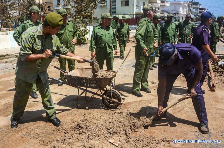 Miembros de las Fuerzas Armadas Revolucionarias de Cuba participan durante las labores de recuperación y limpieza tras el paso del huracán Irma, en una calle en el municipio Plaza de la Revolución, en La Habana, Cuba, el 11 de septiembre de 2017. El huracán Irma dejó al menos 10 muertos en Cuba, aseguró el lunes un informe del Estado Mayor de la Defensa Civil de la isla publicado por la televisión estatal. Los fallecidos son de las provincias de La Habana, Matanzas, Camagüey y Ciego de Avila en el centro y occidente de la isla. (Xinhua/Joaquín Hernández)