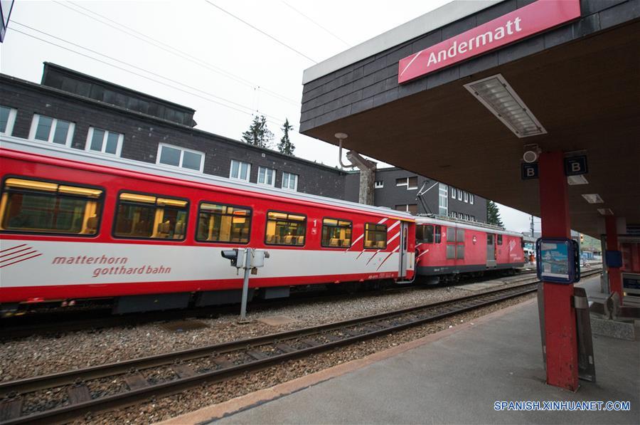 Un tren permanece en la plataforma de la estación de trenes de Andermatt en el cantón de Uri, Suiza, el 11 de septiembre de 2017. Al menos 27 personas resultaron heridas el lunes por el choque de dos trenes ocurrido en la aldea de Andermatt, en el sur de Suiza, a las 11:30 hora local, dijo la policía local. (Xinhua/Xu Jinquan)