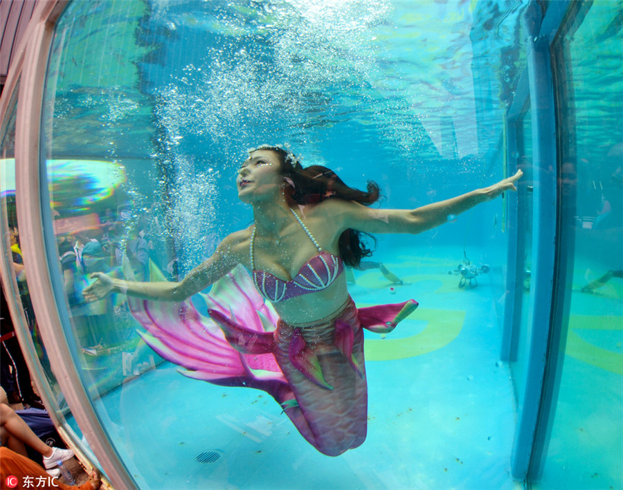 Una competidora realiza una actuación en una piscina durante una competición de sirenas celebrada en Shenzhen, provincia china de Guangdong, el 9 de septiembre de 2017. [Foto / IC]