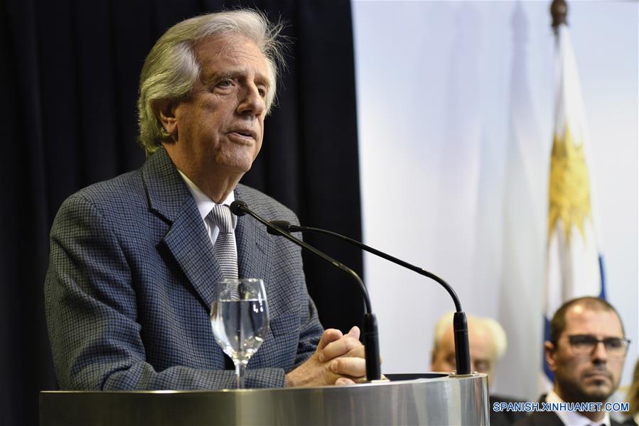 El presidente uruguayo, Tabaré Vázquez, participa durante una conferencia de prensa acerca de la renuncia del vicepresidente Raúl Sendic, en Montevideo, capital de Uruguay, el 11 de septiembre de 2017. El presidente de Uruguay, Tabaré Vázquez, dijo el lunes que el gobierno continuará con normalidad pese a la renuncia del vicepresidente uruguayo, Raúl Sendic. "La situación generada ante la renuncia del se?or Raúl Sendic se ha sustanciado dentro del fuerte marco institucional que felizmente el país tiene, y que es una realidad y un legado que debemos cuidar todos los uruguayos", sostuvo Vázquez. Sendic dimitió el 9 de septiembre acorralado por cuestionamientos éticos sobre gastos personales con una tarjeta corporativa durante su gestión en la estatal Administración Nacional de Combustibles, Alcohol y Portland (ANCAP). (Xinhua/Nicolás Celaya)
