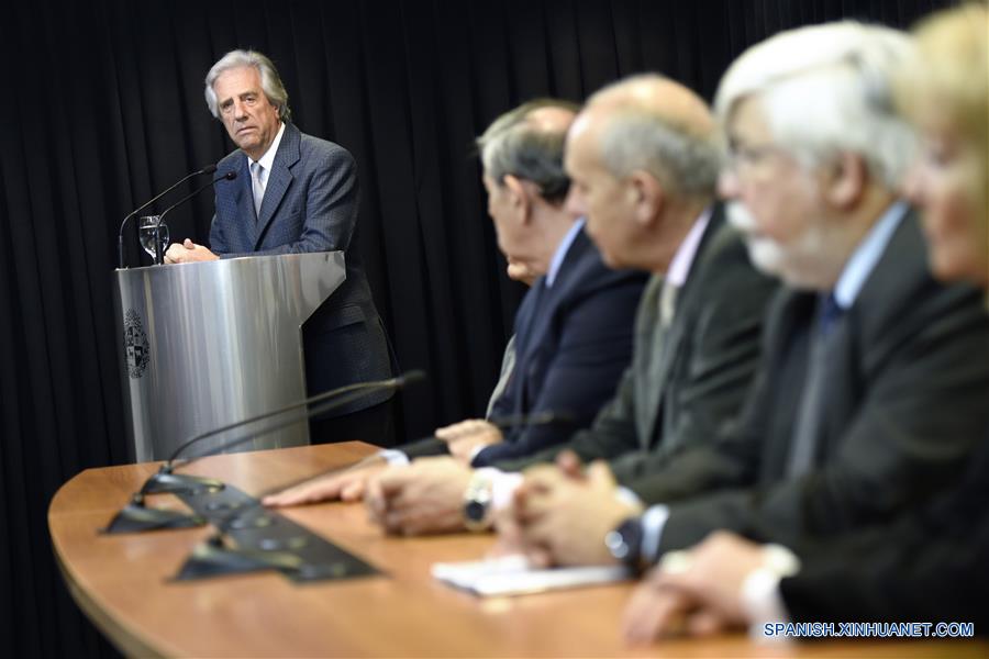 El presidente uruguayo, Tabaré Vázquez (i), acompa?ado por los ministros de gobierno, participa durante una conferencia de prensa acerca de la renuncia del vicepresidente Raúl Sendic, en Montevideo, capital de Uruguay, el 11 de septiembre de 2017. El presidente de Uruguay, Tabaré Vázquez, dijo el lunes que el gobierno continuará con normalidad pese a la renuncia del vicepresidente uruguayo, Raúl Sendic. "La situación generada ante la renuncia del se?or Raúl Sendic se ha sustanciado dentro del fuerte marco institucional que felizmente el país tiene, y que es una realidad y un legado que debemos cuidar todos los uruguayos", sostuvo Vázquez. Sendic dimitió el 9 de septiembre acorralado por cuestionamientos éticos sobre gastos personales con una tarjeta corporativa durante su gestión en la estatal Administración Nacional de Combustibles, Alcohol y Portland (ANCAP). (Xinhua/Nicolás Celaya)