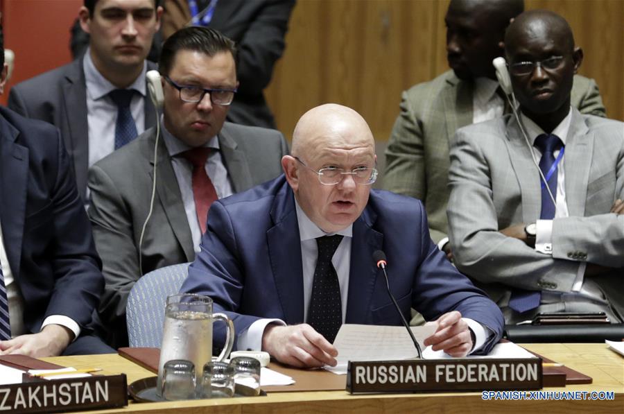 El representante permanente de Rusia ante la Organización de las Naciones Unidas (ONU), Vassily Nebenzia (frente), pronuncia un discurso luego de una reunión del Consejo de Seguridad de la ONU, en la sede de la ONU, en Nueva York, Estados Unidos, el 11 de septiembre de 2017. El Consejo de Seguridad de la ONU adoptó el lunes por unanimidad una resolución que impone nuevas sanciones contra República Popular Democrática de Corea (RPDC) por la prueba nuclear realizada el 3 de septiembre en violación de resoluciones anteriores. (Xinhua/Li Muzi)