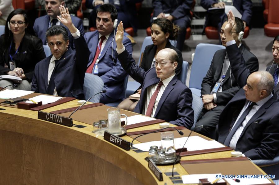 El representante permanente de China ante la Organización de las Naciones Unidas (ONU), Liu Jieyi (c-frente), vota a favor de una resolución del Consejo de Seguridad para imponer nuevas sanciones a República Popular Democrática de Corea (RPDC) por su último ensayo nuclear, en la sede de la ONU, en Nueva York, Estados Unidos, el 11 de septiembre de 2017. El Consejo de Seguridad de la ONU adoptó el lunes por unanimidad una resolución que impone nuevas sanciones contra República Popular Democrática de Corea (RPDC) por la prueba nuclear realizada el 3 de septiembre en violación de resoluciones anteriores. (Xinhua/Li Muzi)