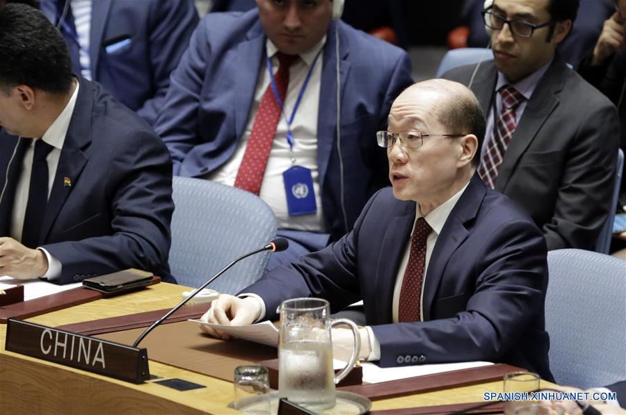 El representante permanente de China ante la Organización de las Naciones Unidas (ONU), Liu Jieyi (c-frente), pronuncia un discurso durante una reunión del Consejo de Seguridad de la ONU, en la sede de la ONU, en Nueva York, Estados Unidos, el 11 de septiembre de 2017. El Consejo de Seguridad de la ONU adoptó el lunes por unanimidad una resolución que impone nuevas sanciones contra República Popular Democrática de Corea (RPDC) por la prueba nuclear realizada el 3 de septiembre en violación de resoluciones anteriores. (Xinhua/Li Muzi)