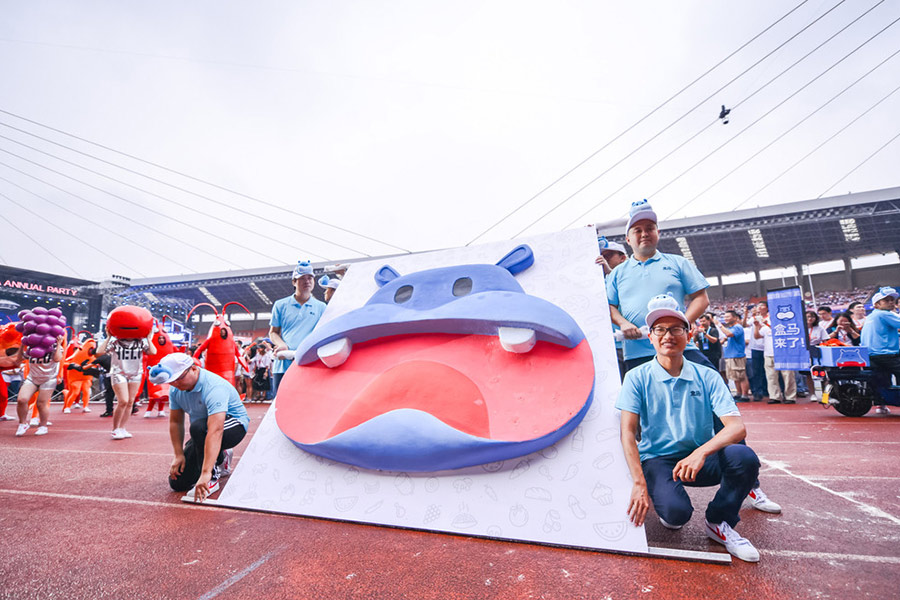 Hema Xiansheng, un nuevo supermercado online-a-offline operado por Alibaba, durante el desfile en una fiesta para conmemorar el 18 aniversario de la fundación del gigante chino de comercio electrónico Alibaba Group en el Centro Deportivo Dragón Amarillo en la ciudad de Hangzhou, provincia de Zhejiang, el 8 de septiembre de 2017. [Foto / IC]