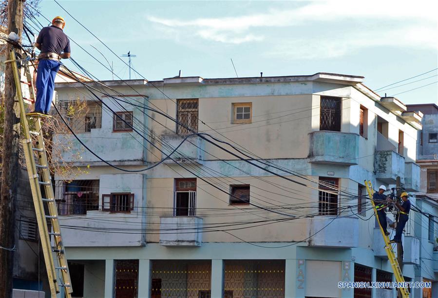 LA HABANA, septiembre 17, 2017 (Xinhua) -- Empleados revisan los cables de electricidad en el municipio Cerro, en la ciudad de La Habana, en Cuba, el 17 de septiembre de 2017. Una semana después del paso del huracán Irma por Cuba, los habitantes de la isla se esfuerzan por recuperarse de los destrozos causados por el violento meteoro que alcanzó la categoría cinco, la máxima de la escala Saffir-Simpson. Miles de cubanos salieron este fin de semana a las calles de La Habana en cumplimiento de un llamado gubernamental para cooperar con el saneamiento de la capital, donde viven más de dos millones de personas. El paso de Irma, considerado el mayor huracán formado en el Atlántico, dejó de manera preliminar 10 muertos, 1,7 millones de personas desalojadas, fuertes inundaciones y graves da?os en el sistema eléctrico nacional. (Xinhua/Joaquín Hernández)