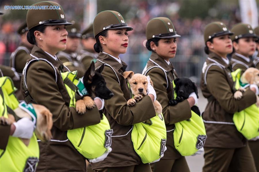 Miembros de los carabineros de Chile participan durante la Gran Parada Militar en Honor a las Glorias del Ejército 2017, en Santiago, capital de Chile, el 19 de septiembre de 2017. Más de 7,000 efectivos uniformados de las Fuerzas Armadas de Chile desfilaron el martes durante la Parada Militar 2017, una ceremonia anual encabezada por la presidenta del país, Michelle Bachelet, en el Parque O'Higgins de Santiago. (Xinhua/Jorge Villegas)