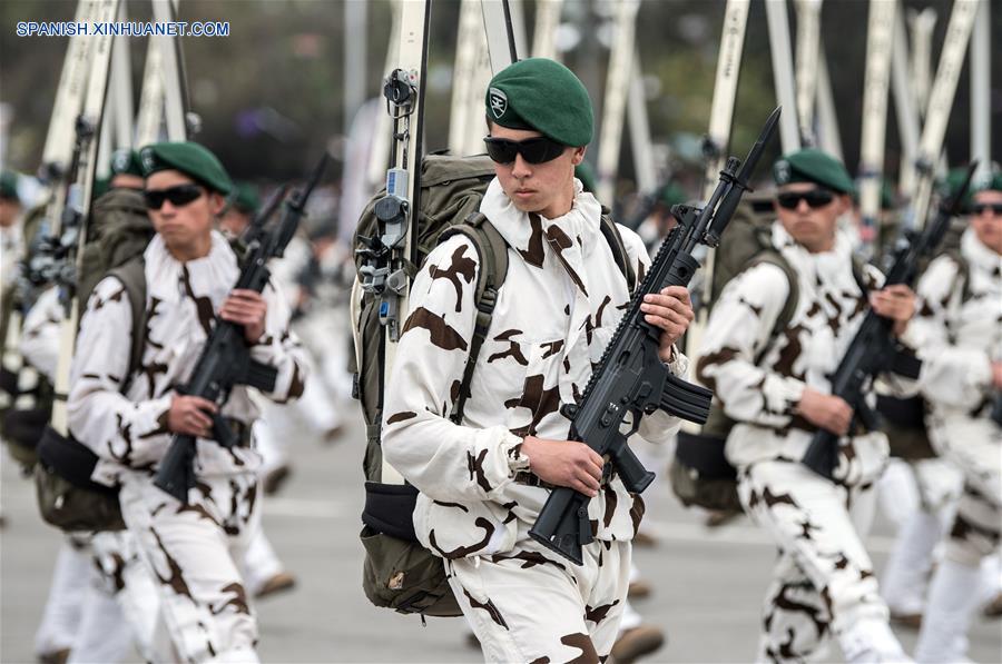 Soldados participan durante la Gran Parada Militar en Honor a las Glorias del Ejército 2017, en Santiago, capital de Chile, el 19 de septiembre de 2017. Más de 7,000 efectivos uniformados de las Fuerzas Armadas de Chile desfilaron el martes durante la Parada Militar 2017, una ceremonia anual encabezada por la presidenta del país, Michelle Bachelet, en el Parque O'Higgins de Santiago. (Xinhua/Jorge Villegas)