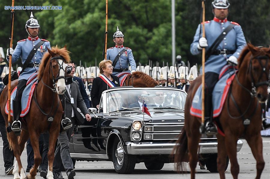 La presidenta de Chile, Michelle Bachelet (c) participa durante la Gran Parada Militar en Honor a las Glorias del Ejército 2017, en Santiago, capital de Chile, el 19 de septiembre de 2017. Más de 7,000 efectivos uniformados de las Fuerzas Armadas de Chile desfilaron el martes durante la Parada Militar 2017, una ceremonia anual encabezada por la presidenta del país, Michelle Bachelet, en el Parque O'Higgins de Santiago. (Xinhua/Jorge Villegas)