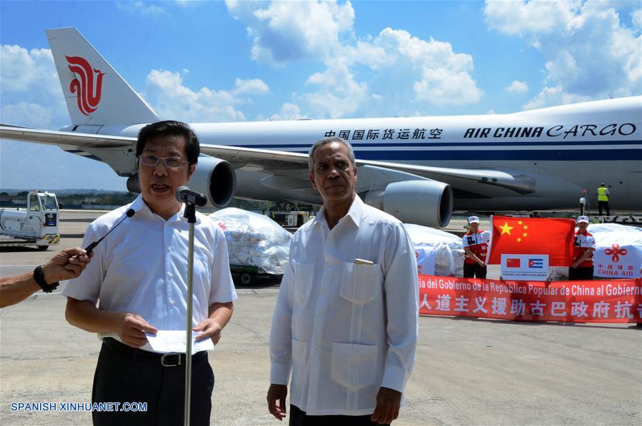 LA HABANA, septiembre 22, 2017 (Xinhua) -- El embajador de China en Cuba, Chen Xi (i), acompa?ado por Antonio Carricarte (d), viceministro primero de Comercio Exterior e Inversión Extranjera de Cuba, pronuncia un discurso durante una ceremonia por la llegada de ayuda humanitaria procedente de China para los cubanos damnificados por el huracán Irma, en el Aeropuerto Internacional José Martí en La Habana, Cuba, el 22 de septiembre de 2017. El primer avión con 86 toneladas de ayuda humanitaria enviadas por China a Cuba tras el paso del huracán Irma por esta nación caribe?a arribó el viernes a La Habana donde fue recibido por altas autoridades de la Isla y un equipo de la Cruz Roja china. El avión 747 de Air China llegó al aeropuerto internacional José Martí con materiales para la reconstrucción del país, entre ellos tiendas de campa?a, grupos electrógenos, colchones, frazadas, bombas de agua, luminarias, entre otros. Al recibir el donativo, el embajador chino en Cuba, Chen Xi, se?aló que partiendo de las relaciones tradicionalmente amistosas entre los dos pueblos, el gobierno de China decidió enviar esta ayuda humanitaria para ayudar a esta nación caribe?a en sus esfuerzos de recuperación. (Xinhua/Joaquín Hernández)