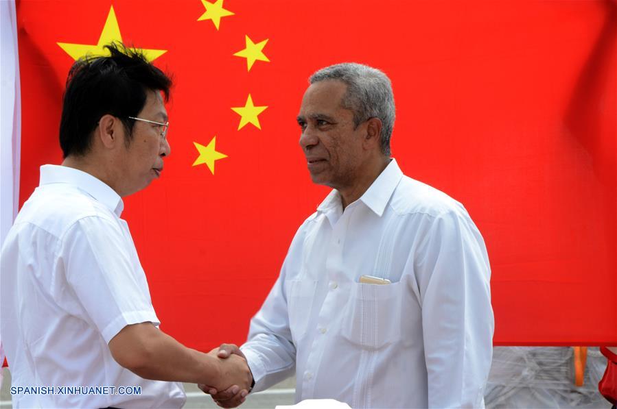 LA HABANA, septiembre 22, 2017 (Xinhua) -- El embajador de China en Cuba, Chen Xi (i), estrecha la mano con Antonio Carricarte (d), viceministro primero de Comercio Exterior e Inversión Extranjera de Cuba, durante una ceremonia por la llegada de ayuda humanitaria procedente de China para los cubanos damnificados por el huracán Irma, en el Aeropuerto Internacional José Martí en La Habana, Cuba, el 22 de septiembre de 2017. El primer avión con 86 toneladas de ayuda humanitaria enviadas por China a Cuba tras el paso del huracán Irma por esta nación caribe?a arribó el viernes a La Habana donde fue recibido por altas autoridades de la Isla y un equipo de la Cruz Roja china. El avión 747 de Air China llegó al aeropuerto internacional José Martí con materiales para la reconstrucción del país, entre ellos tiendas de campa?a, grupos electrógenos, colchones, frazadas, bombas de agua, luminarias, entre otros. Al recibir el donativo, el embajador chino en Cuba, Chen Xi, se?aló que partiendo de las relaciones tradicionalmente amistosas entre los dos pueblos, el gobierno de China decidió enviar esta ayuda humanitaria para ayudar a esta nación caribe?a en sus esfuerzos de recuperación. (Xinhua/Joaquín Hernández)