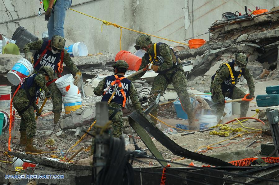 CIUDAD DE MEXICO, septiembre 24, 2017 (Xinhua) -- Soldados trabajan en las labores de búsqueda y rescate en un edificio colapsado en Alvaro Obregón 286 luego de un sismo, en la Ciudad de México, capital de México, el 24 de septiembre de 2017. El gobierno de México actualizó el domingo a 320 el número de muertos por el terremoto de 7,1 grados en la escala Richter registrado el pasado 19 de septiembre en el centro del país. (Xinhua/Str)