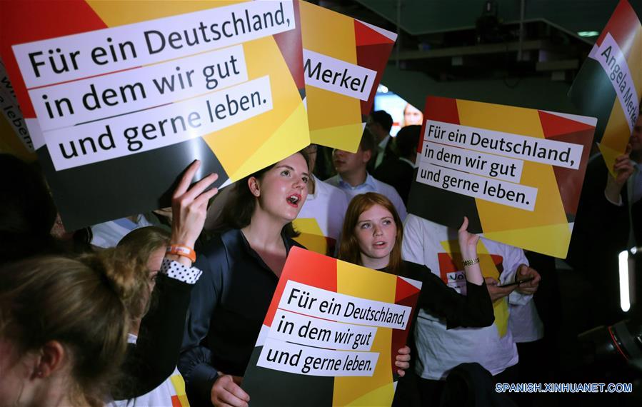 BERLIN, septiembre 24, 2017 (Xinhua) -- Simpatizantes de la canciller de Alemania, Angela Merkel, celebran luego de escuchar los resultados de la encuesta de salida en la sede de la Unión Demócrata Cristiana (UDC), en Berlín, Alemania, el 24 de septiembre de 2017. La unión conservadora encabezada por la canciller de Alemania, Angela Merkel, defendió el domingo su posición dominante en el Parlamento alemán al recibir 32.5 por ciento de los votos, de acuerdo con una encuesta de salida. (Xinhua/Luo Huanhuan)