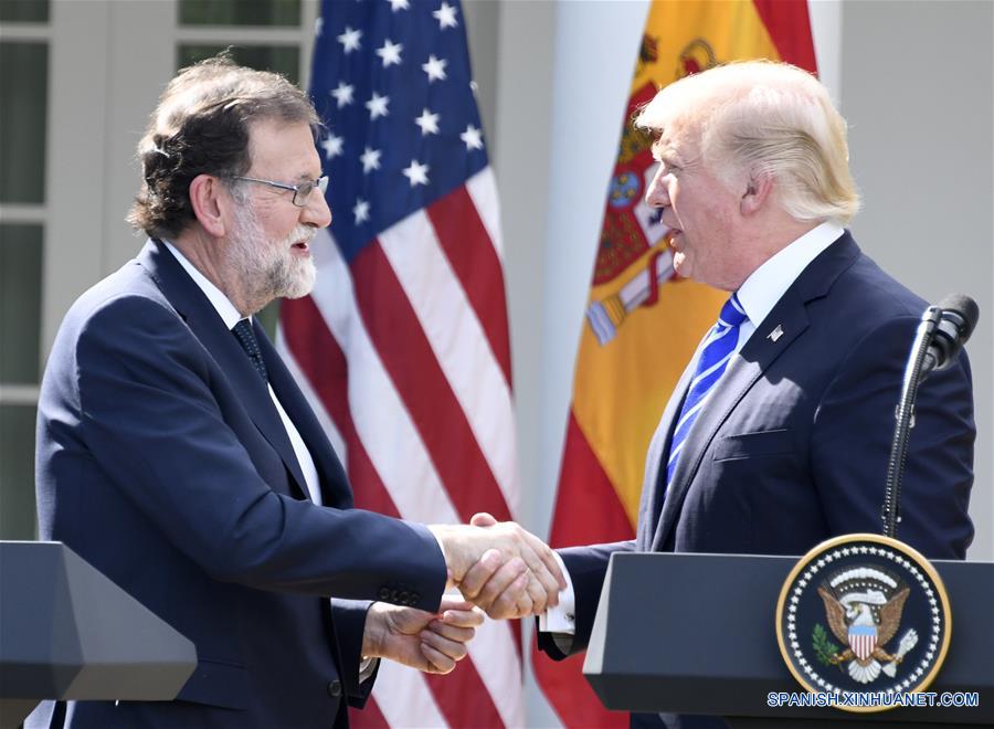 El presidente estadounidense, Donald Trump (d), estrecha la mano con el presidente del Gobierno espa?ol, Mariano Rajoy (i), durante una conferencia de prensa conjunta en el Jardín de las Rosas en la Casa Blanca, Washington D.C., Estados Unidos, el 26 de septiembre de 2017. En una conferencia de prensa conjunta con el presidente del gobierno espa?ol, Mariano Rajoy, el presidente de Estados Unidos, Donald Trump, pidió a las naciones aislar aún más a República Popular Democrática de Corea (RPDC) en respuesta a sus programas nuclear y de misiles. El desarrollo de armas nucleares y misiles de RPDC "amenaza a todo el mundo con pérdidas inimaginables de vida. Todos los países deben actuar ahora para garantizar la total desnuclearización del régimen", dijo Trump. En las últimas semanas, Estados Unidos y RPDC han mantenido un acalorado debate que se intensificó después de que Trump publicó en Twitter un mensaje que irritó a Pyongyang. (Xinhua/Ron Sachs/CNP/ZUMAPRESS)