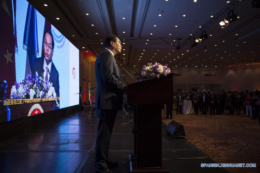 El embajador de China en Argentina, Yang Wanming, pronuncia un discurso durante una recepción para festejar el 68 aniversario de la fundación de la República Popular China, en Buenos Aires, Argentina, el 26 de septiembre de 2017. El embajador chino ante Argentina, Yang Wanming, afirmó el martes que la "nueva normalidad" del país asiático es una "gran oportunidad para profundizar y expandir la cooperación" entre Beijing y Buenos Aires. "Durante estos últimos cinco a?os, la integración de China con el mundo ha alcanzado un nuevo nivel. La parte china apuesta por construir nuevas relaciones internacionales, con foco en la cooperación de ganancia compartida", enfatizó el diplomático. Yang hizo estas declaraciones durante una recepción para festejar el 68 aniversario de la fundación de la República Popular China, acto al que asistieron, entre otros, el gobernador de la provincia de Jujuy, Gerardo Morales, el ministro de Ambiente y Desarrollo Sustentable, Sergio Bergman, y el diputado oficialista Eduardo Amadeo. (Xinhua/Martín Zabala)