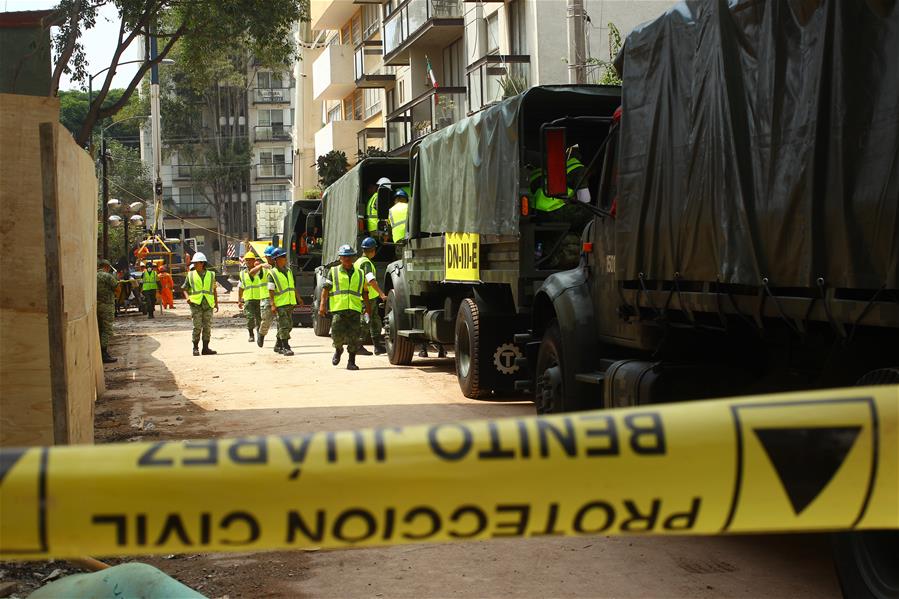CIUDAD DE MEXICO, septiembre 27, 2017 (Xinhua) -- Soldados vigilan en el cruce de las calles de Escocia y Gabriel Mancera luego de un sismo, en la Ciudad de México, capital de México, el 27 de septiembre de 2017. El presidente de México, Enrique Pe?a Nieto, calculó el miércoles en 38,150 millones de pesos (unos 2,119 millones de dólares estadounisenses) el costo de la reconstrucción por los terremotos del 7 y 19 de septiembre. A poco más de una semana de registrarse un terremoto de 7,1 grados en la escala de Richter que golpeó al centro del país y que se ha cobrado hasta ahora la vida de 338 personas, el mandatario agradeció el respaldo del sector privado para facilitar las obras de reconstrucción. Ese terremoto se registró 12 días después de que México se sacudiera por otro sismo, este de 8,4 grados, calificado por el gobierno como el "de mayor intensidad" en un siglo en el sur del país. (Xinhua/Str)