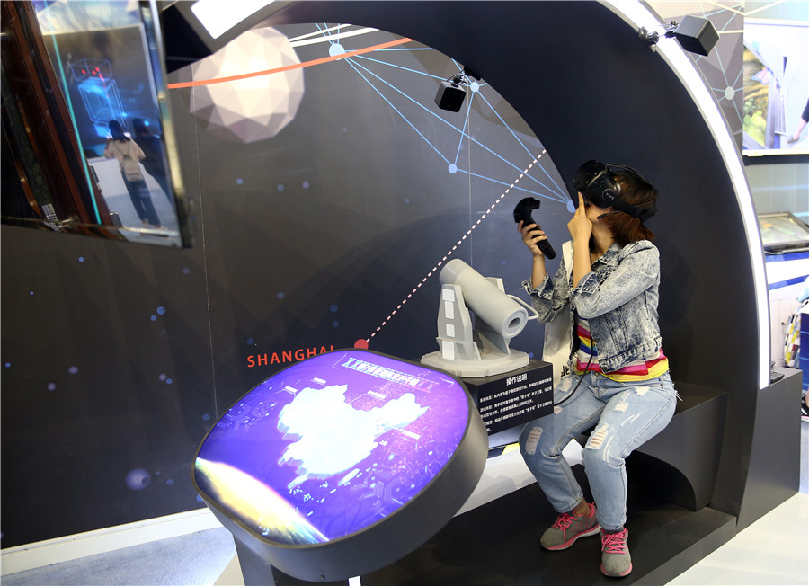 En el Salón de Exposiciones de Beijing, una mujer experimenta la comunicación cuántica utilizando tecnología de realidad virtual en la sala de exposiciones de Beijing el miércoles. (Foto: Zou Hong)