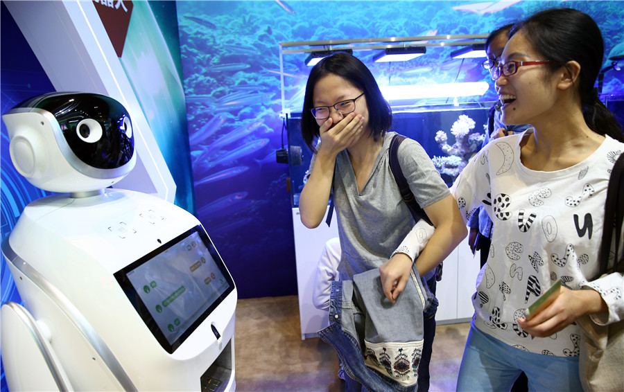 Dos visitantes interactúan con un robot que responde a sus preguntas en el Salón de Exposiciones de Beijing. (Foto: Zou Hong)